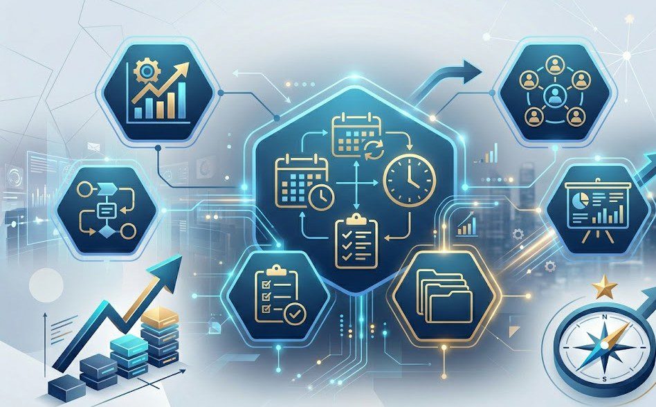 Glowing digital infographic network with icons for time management, calendars, file organization, task checklists, efficient workflow diagrams, and upward-trending charts, set against a modern cityscape background, conveying seamless organization and productivity without text.