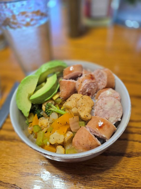 3. Build the Bowl: Put your rice at the bottom. Pile the sausage and veggie mix over the top so the rice is mostly covered.